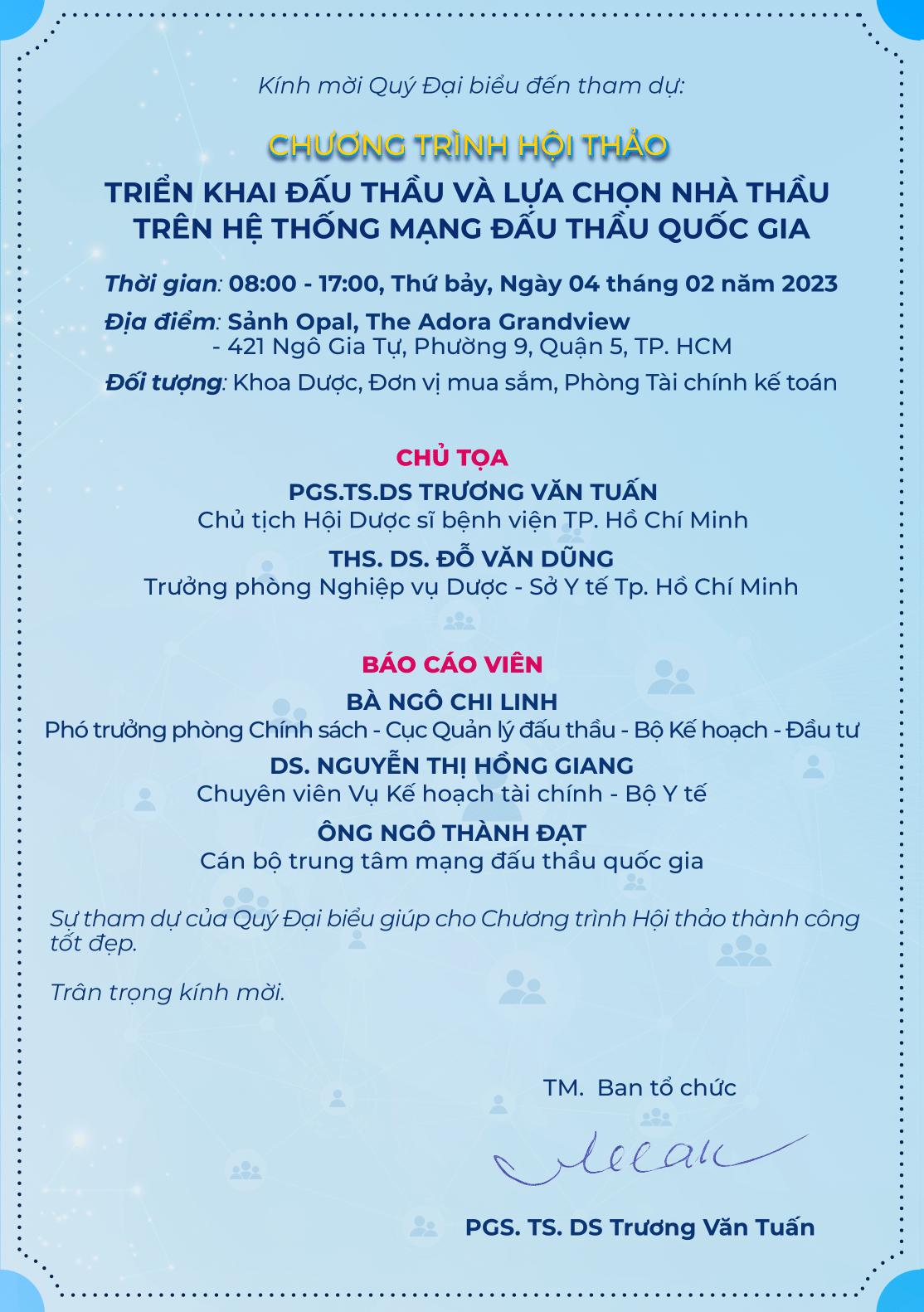 Ngày 04/02/2022 tại trung tâm hội nghị Trung tâm Hội Nghị The Adora Grand View, số 421 Ngô Gia Tự, Phường 9, Quận 5, TP. HCM đã diễn ra HỘI THẢO TRIỂN KHAI ĐẤU THẦU VÀ LỰA CHỌN NHÀ THẦU TRÊN HỆ THỐNG MẠNG ĐẤU THẦU QUỐC GIA, do Hội Dược Sỹ Bệnh viện TP. HCM tổ chức. Hội thảo đã thu hút sự quan tâm đặc biệt, có hơn 300 đại biểu từ các bệnh viện công lập trên địa bàn TP. HCM, các công ty phân phối và các khách mời đã đến tham dự, có nhiều đại biểu đã đến từ rất sớm.