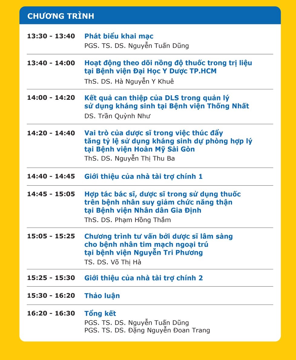 Được sự chấp thuận của Hội Dược học TP. Hồ Chí Minh, Hội dược sĩ bệnh viện TP. Hồ Chí Minh sẽ cấp chứng chỉ đào tạo 4 tiết cho quý đồng nghiệp tham dự đủ 70% thời lượng buổi hội thảo và trả lời đúng 7/10 câu hỏi bài kiểm tra sau khi kết thúc buổi hội thảo.