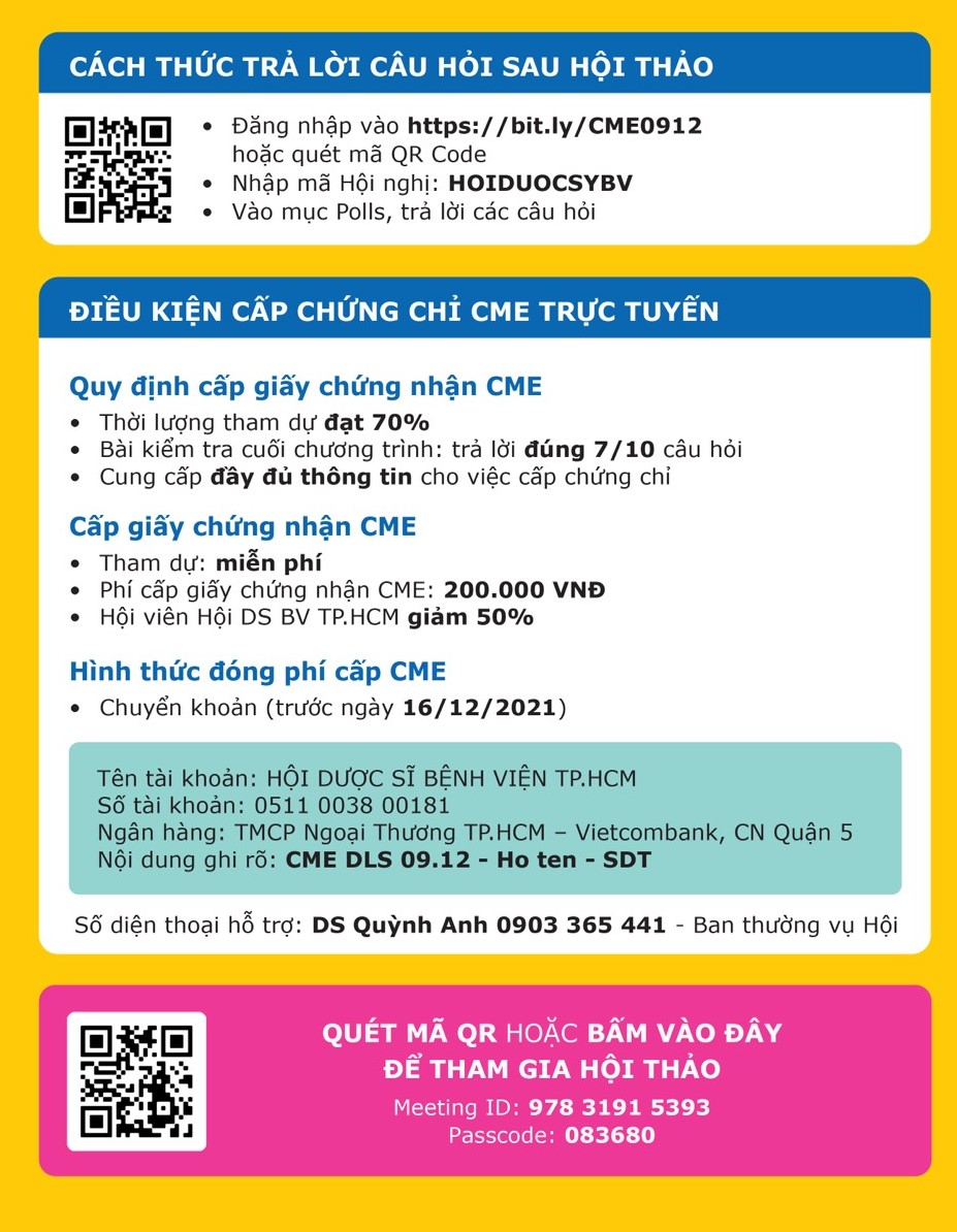 Chi phí nhận CME : 200.000 vnđ (ngoại trừ khách mời), Hội viên Hội DS BV TP. HCM giảm 50% (Danh sách hội viên đã được Khoa Dược các BV gửi về BCH Hội DS BV TP. HCM)